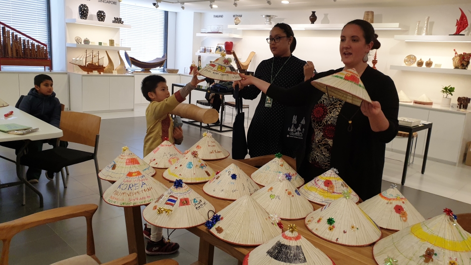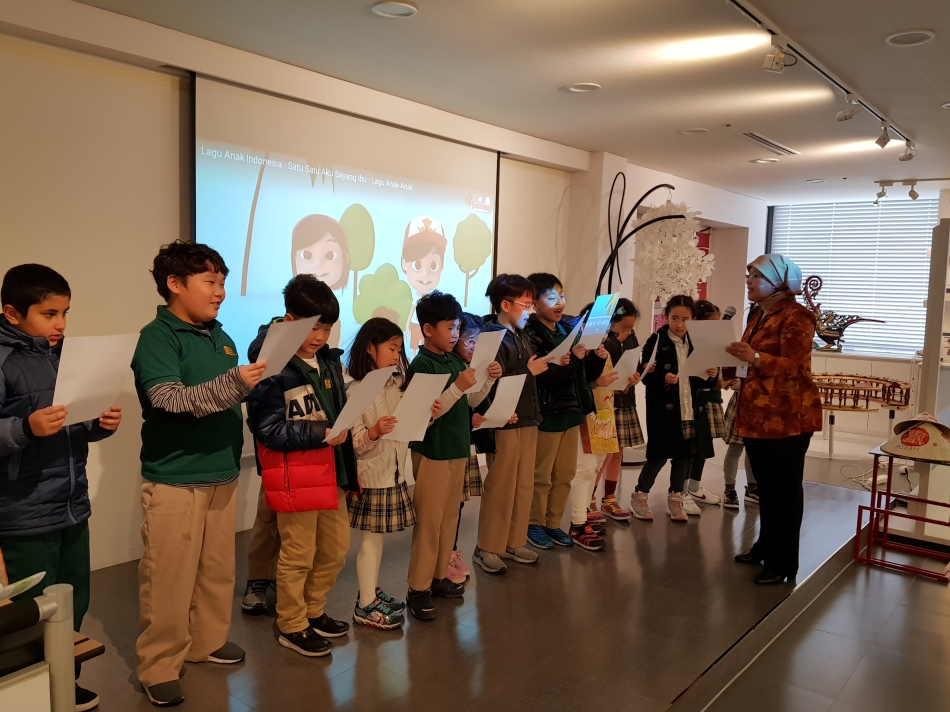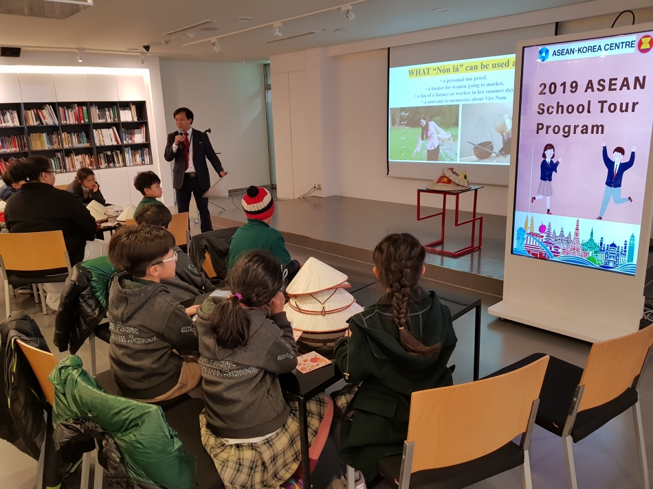 March 13 marked the 10th Anniversary since the founding of ASEAN-Korea Centre (AKC), and the day where 25 students and 5 teachers from Asia Pacific International School came to visit the ASEAN Hall. In lieu of the special occasion, various activities were conducted such as the “ASEAN Golden Bell Quiz”, a sing-along of “Satu-satu”, a popular Indonesian children’s song, and the decorating of “Non La”, which are traditional Vietnamese bamboo palm leaf conical hats. We also had 3 of the Centre’s ASEAN officials taking part in the program with Mr Nongchith Khambounheuang, Head of Trade and Investment (Laos) delivering the welcoming address and introductory briefing on ASEAN and the Centre, Mme. Siti Tri Joelyartini, Deputy Head of General Affairs Unit (Indonesia) leading the sing-along session, and Mr. Phan The Thang, Deputy Head of Information and Data Unit (Viet Nam) concluding the activities session with the decorating of the “Non La”.