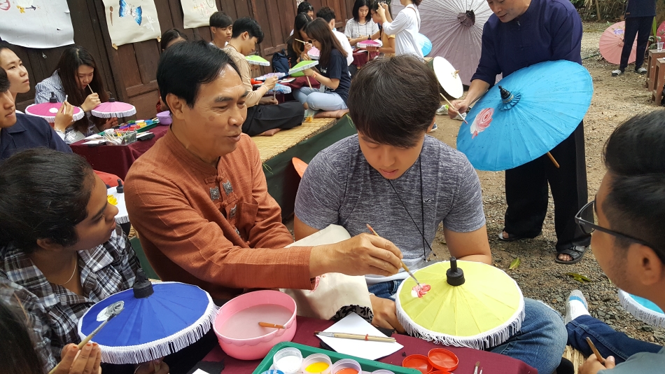 ▲ Participants during Traditional Culture Experience – Umbrella Painting | Sankampaeng Silk Chalermraja Cultural Center, Chiang Mai, Thailand