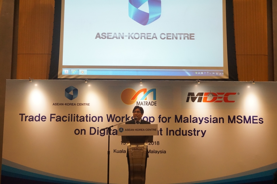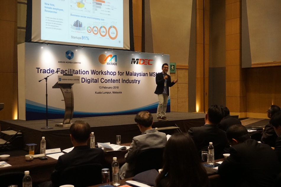 ASEAN-Korea Centre organized the Trade Facilitation Workshop for Malaysian MSMEs on Digital Content Industry on 12-13 February 2018 in Kuala Lumpur, Malaysia. Jointly organized with Malaysia External Trade Development Corporation(MATRADE) and Malaysia Digital Economy Corporation(MDEC), the Workshop aimed to enhance competitiveness of Malaysian MSMEs in the digital content sector, thereby facilitating trade between Korea and Malaysia. Korean delegations, composed of members from 10 companies and an expert from Gyeong-gi Center for Creative Economy & Innovation, shared their expertise and conducted one-on-one business meetings with local MSMEs at the Trade Facilitation Seminar.