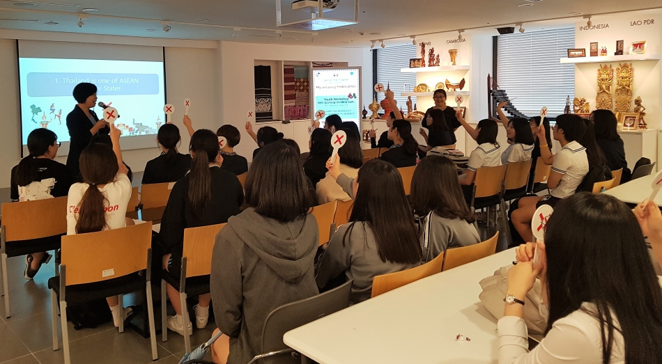 The Youth Workshop was held on Wednesdays from 1 August to 5 September. It offered a wide range of programs, including a lecture on Thailand-Korea relations; Thai quiz contest; Thai traditional clothing experience; ‘My Amazing Thailand’ poster making; special talks on Thailand and ASEAN; as well as a career exploration activity. In addition, special sessions on Thailand and Thai-ROK relations have been also conducted by Mr. Sribhongse Bunnag, Second Secretary, Ms. Sarocha Rachawong and Ms. Pitchaya Maiboonkaew, Public Sector Development Officers from Royal Thai Embassy in Korea. The Youth Workshop composed of 5 sessions has been successfully completed in recording the number of 200 attendees including junior and high school students, teachers, parents and experts for multicultural education, etc.