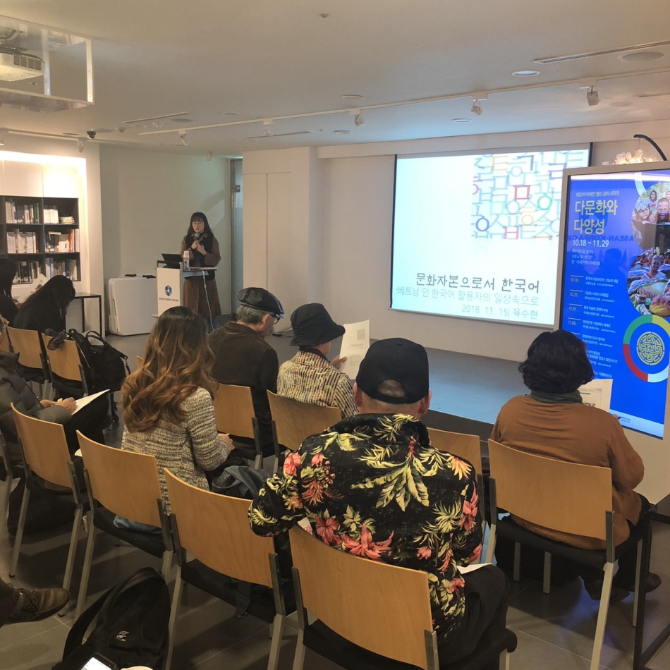 Following this, Dr. Youk Su-hyun, Senior Researcher at the Center for Social Sciences in Seoul National University gave a lecture on the topic ‘Korean as a cultural capital’. In this lecture, Ms. Youk talked about how the increase in Vietnam’s investment into South Korea has led to an increase in the number of large and Small and Medium Enterprises (SMEs) venturing from South Korea into the Vietnamese market. Consequently, this phenomenon has led to a rise in demand and popularity of the Korean language in Vietnam, with about 2,000 Korean language majors graduating from universities in Vietnam that offers this major annually. One of the main reasons to why this is so is
