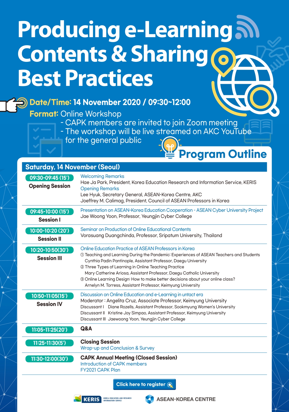 - Following the online workshop, participants are requested to fill out an online survey. The URL link for the online survey will be sent via pre-registered email