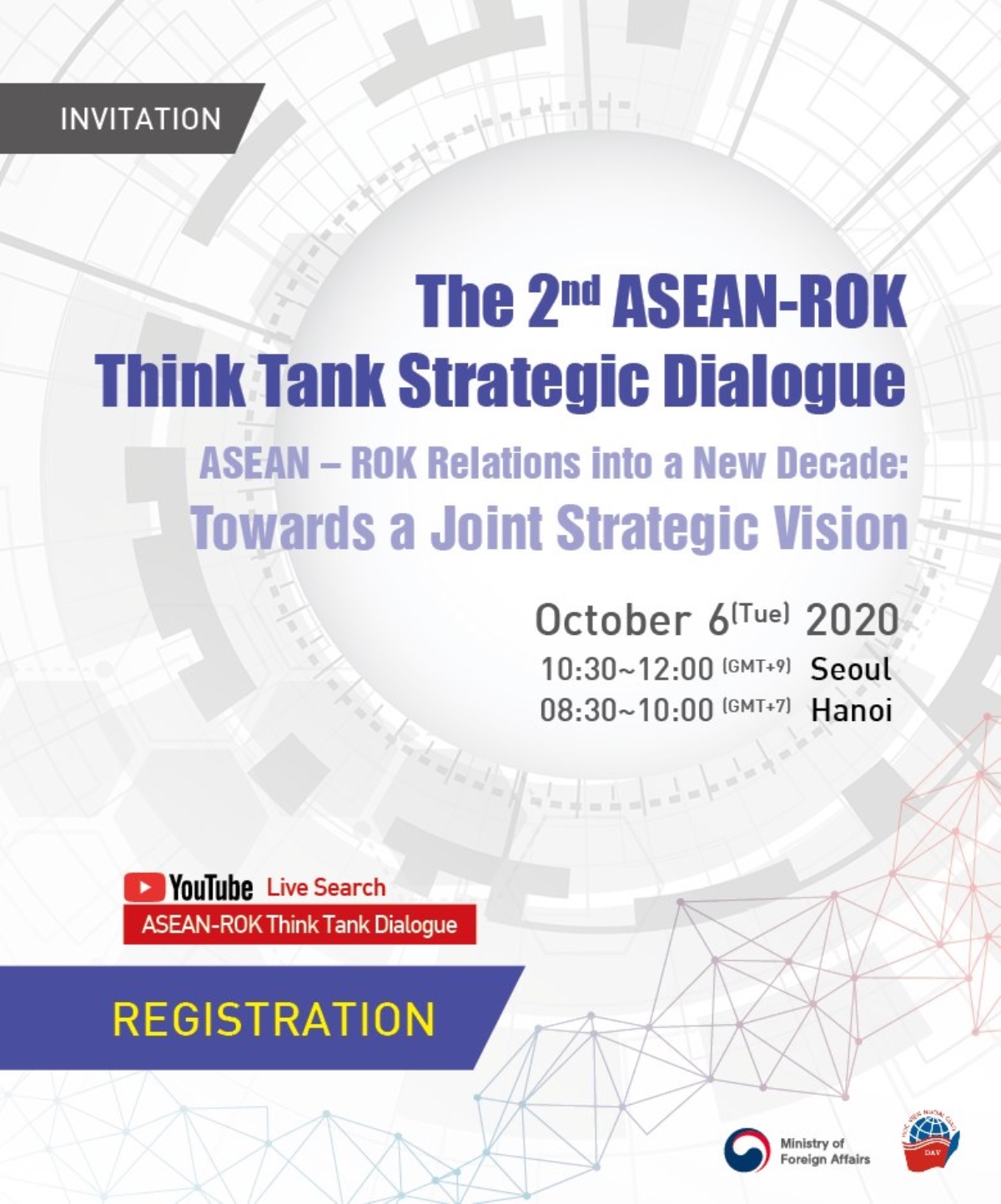 The 2nd ASEAN-ROK Think Tank Strategic Dialogue, to be co-hosted by the Korea National Diplomatic Academy (KNDA) of the Ministry of Foreign Affairs and the Diplomatic Academy of Vietnam (DAV), will be held in a blended online format given that a face-to-face meeting is not possible due to the global spread of COVID-19.
