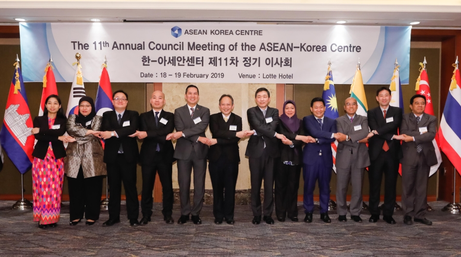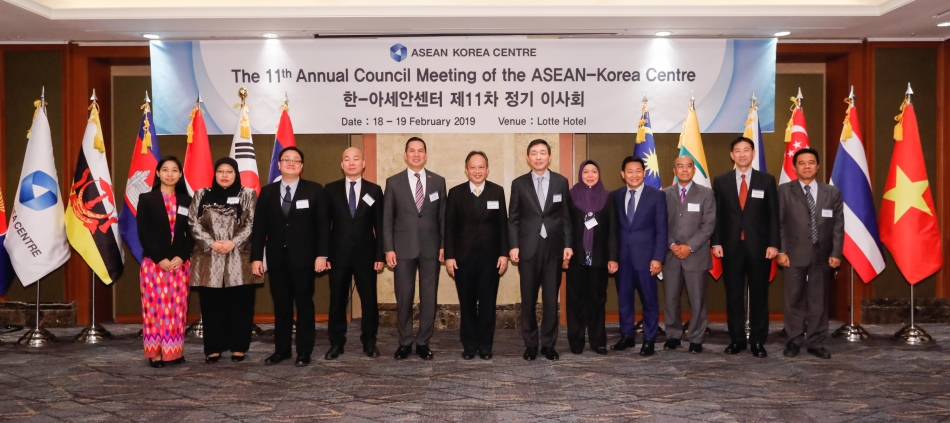 2019년 2월 18일부터 19일 양일 간 한-아세안센터는 서울에서 제11차 정기 이사회를 개최하였습니다. 이사회는 한-아세안센터의 최고 의사 결정기구이며 한국과 아세안 10개국 총 11개국의 관련 부처 고위관료, 주한 아세안 대사 등 각 회원국 대표로 구성되어 있습니다.