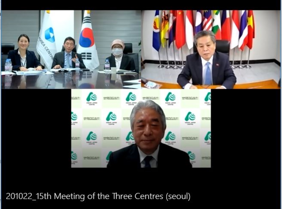 한-아세안센터는 2020년 10월 22일 15시 일-아세안센터, 중-아세안센터와 제15차 삼국센터 회의를 온라인으로 진행했습니다. 매년 개최되는 삼국센터의 정례회의에서는 각 센터의 주요 협력 사업들을 소개하고, 사업 성과를 공유하며, 삼국센터의 협력방향 등에 대해 논의합니다.
