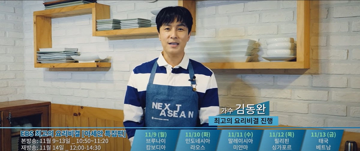 한-아세안센터는 2020년 11월 9일부터 13일까지 EBS1에서 방영된 ‘최고의 요리비결 아세안 특집편’을 통해 아세안 10개국이 선정한 소울푸드 레시피와 손쉽게 따라할 수 있는 요리법을 소개하였습니다.