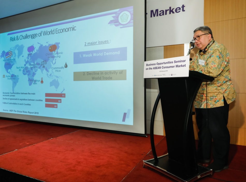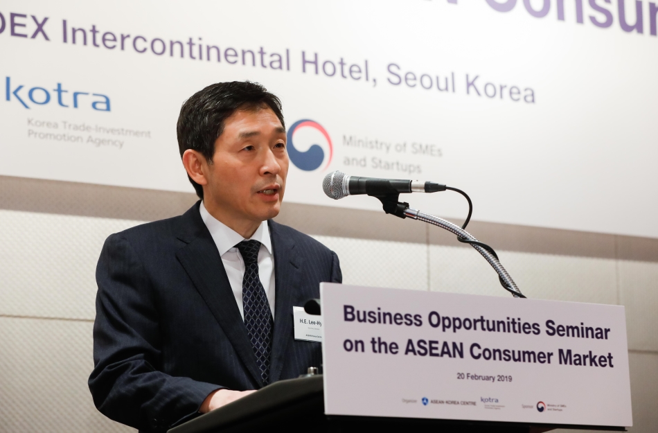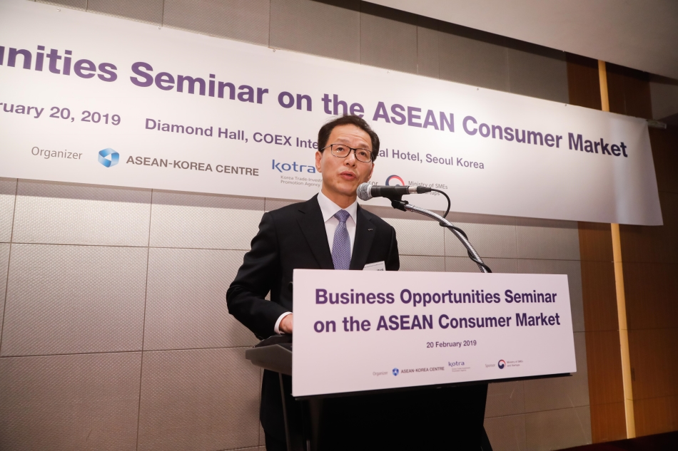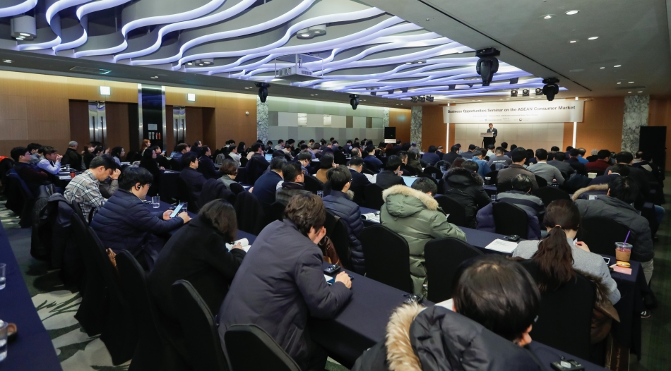 한-아세안센터(사무총장 이혁)는 대한무역투자진흥공사(KOTRA)와 공동으로 2월20일(수) 코엑스 인터컨티넨탈 호텔에서 ‘아세안 소비시장 진출전략 세미나’를 개최하였습니다. 세미나는 아세안 5개국(인도네시아, 필리핀, 싱가포르, 태국, 베트남)의 소비시장 분석가, 유통사, 바이어 등 15명을 초청해, 한국 기업인 200여명을 대상으로 아세안 소비시장 동향 및 진출 기회에 대해 소개하는 설명회와 비즈니스 네트워킹으로 구성되었습니다.