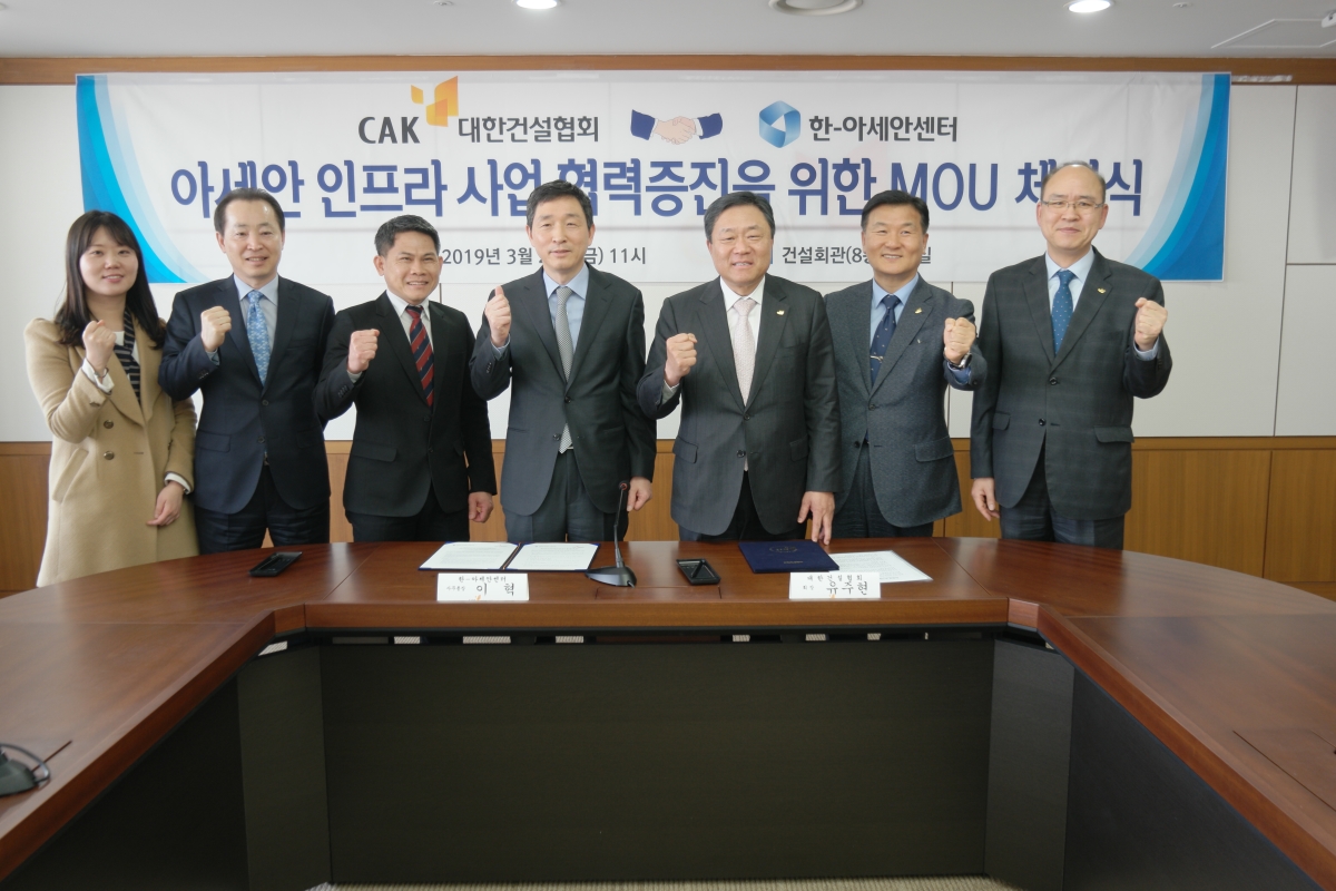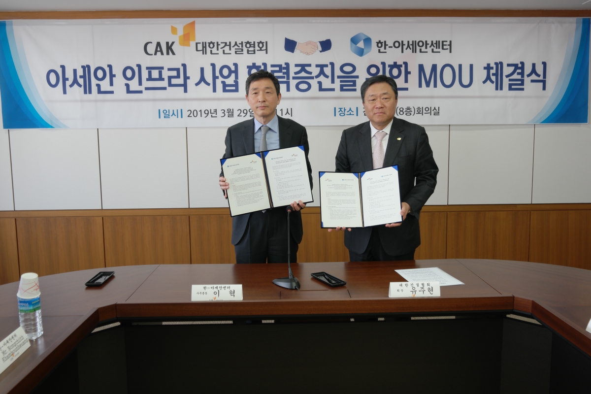 한-아세안센터는 대한건설협회(CAK·회장 유주현)와 3월 29일(금) 대한건설협회 회의실에서 ´아세안 투자개발 진출 지원 업무협약(MOU)’을 체결했습니다. 양 기관은 이번 업무협약을 계기로 한국과 아세안 간 인프라 분야 활성화를 위한 협력사업, 인력양성 및 네트워크 구축 등을 공동으로 진행하게 됩니다. 한-아세안센터와 대한건설협회는 7월 9-10일에 개최되는 ‘제7차 아세안 연계성 포럼’을 공동 주최하기로 합의하여 국내 인프라 기업인들에게 아세안의 교통, 에너지, 스마트시티 프로젝트 소개 및 아세안 대표단과의 1:1 비즈니스 미팅을 시행할 예정입니다.