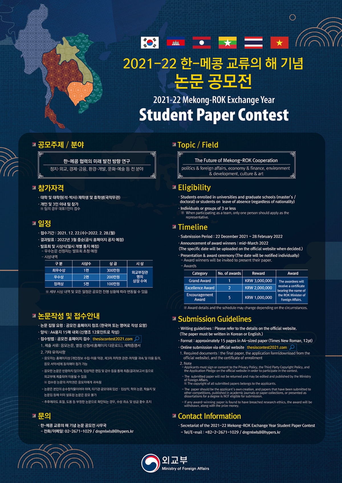 외교부는 한국과 메콩국가 간 교류·협력에 대한 청년들의 관심 및 연구의욕을 고취시키기 위하여 「2021-22 한-메콩 교류의 해 기념 논문 공모전」을 개최합니다.