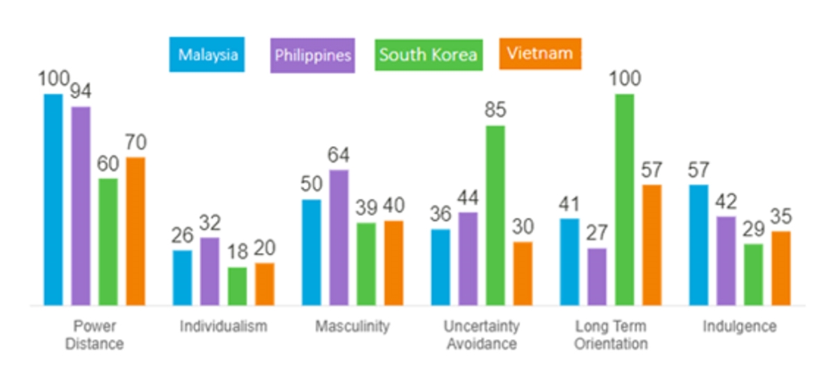 Figure 1. Hofstede’s model applied to Malaysia, the Philippines, Vietnam, & South Korea