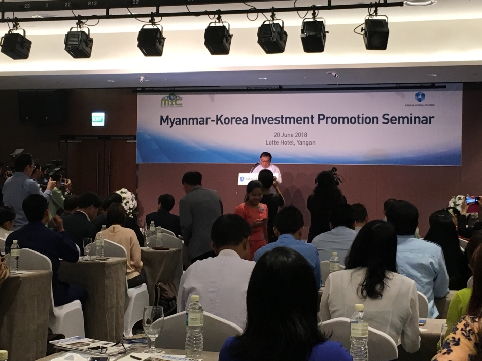 - It is indeed a great pleasure and honor for me to be here today to deliver the welcoming remarks on this occasion of the Myanmar-Korea Investment Promotion Seminar which is jointly organized by the Myanmar Investment Commission and the ASEAN Korea Center.